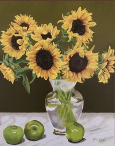 2022Zonnebloemen in vaas met appels rondom de vaas.